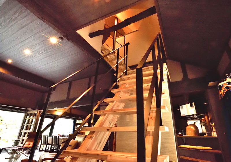 一枚板の大きな特注のテーブル、日本画、置物はじめ京都らしい設え、デザイナーズチェアで大画面の映像、音楽などを楽しんでいただけます。夏には快適なエアコン、冬には薪ストーブの暖かさをお楽しみください。