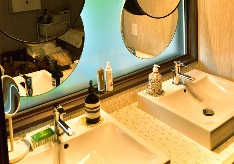 チェックアウトの時間までご自由にお使いいただけます。洗面所はお二人同時に使用可能です。